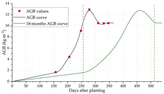 From the estimated AGB in the experimental area, shown in Figure 3, it is possible to obtain a proposed AGB curve. Because the sugarcane types planted in the experimental area and the test site are different, it is necessary to scale this AGB curve.