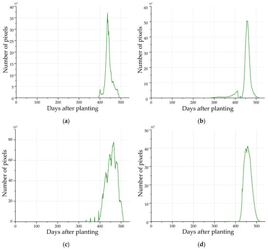 The day after planting of the analyzed area is calculated as the day corresponding to the maximum histogram value. Finally, the remaining days for the predicted harvesting date, when the RI is expected to be maximum, are calculated by subtracting 360 days (or 540 days for the test area) and the day after planting of the analyzed area.