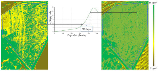 Next, an estimated AGB map of an area of the test site and the corresponding adjusted AGB curve, which varies according to the harvest season, are considered as examples to describe the prediction methods.