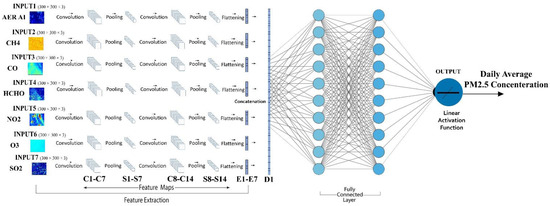Recently, satellite remote sensing has been used in a variety of studies to evaluate air quality [17,18,19,20,21,22,23,24]. For the more accurate methods, an artificial neural network can be utilized as a classifier based on data from road networks and weather data [25]. The deep learning algorithms have achieved significant advancements in image feature learning and have solved numerous challenges in typical computer vision [26]. Image feature-based learning is mainly concerned with the relationships between image characteristics and the index of PM. Liuetal. [27] investigated how air quality relates to image quality. Wang et al. [28] examined air quality by incorporating the association between observed image degradation and PM2.5. Other authors used decision tree in estimating air quality [29]. For example, Zhang et al. [30] used images to calculate air pollution levels with a CNN algorithm. A CNN is a multilayer network structure, whose fundamental structure is comprised of the input layer, convolution layer, pooling layer, fully connected layer and output layer. A convolutional neural network (CNN) is a type of artificial neural network (ANN) that is most typically used to evaluate visual images. It is one of the most widely used types of ANN. This deep learning method can be used to recognize images and videos in a variety of contexts, including recommendation systems, image classification, segmentation, and medical image analysis. The designed CNN was employed to identify photos according to their PM2.5 index via classification. The CNN consists of multiple layers: nine convolutional layers, two pooling layers and two dropout layers, and to overcome the gradient disappearance problem, an enhanced rectified linear unit activation function can be used. Furthermore, the VGG-16CNN model was proposed to evaluate PM2.5 levels [31] on the basis of image-based PM2.5 concentration levels.