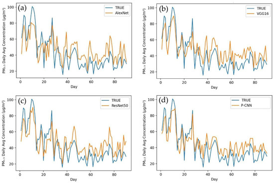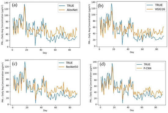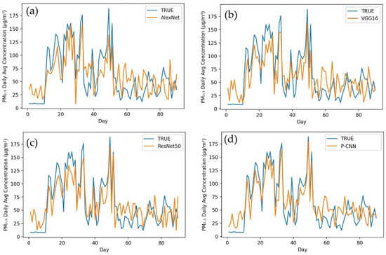 Time series of observed values and predicted values of models for Lahore. (a) AlexNet, (b) VGG16, (c) ResNet50, (d) P-CNN.