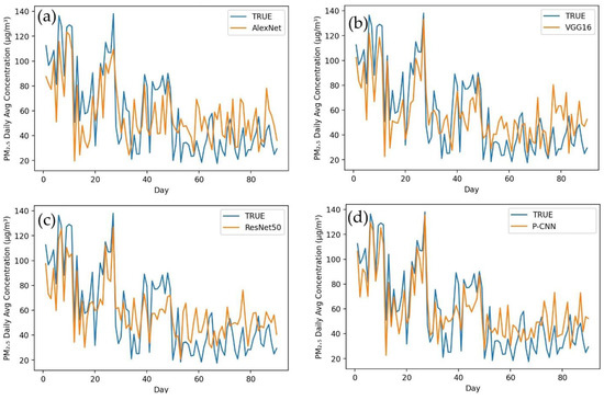 Figure 4 depicts a comparison of the actual values and projected values in a time series graph obtained by applying AlexNet (a), VGG16 (b), ResNet50 (c) and our proposed model P-CNN (d) to a testing dataset for Karachi city. In this figure, the P-CNN obtained values that were more closely aligned with the observed values than AlexNet, VGG16 and ResNet50. According to performance indicators, our P-CNN performs much better than other models in terms of predicting of PM2.5 concentrations. When AlexNet was used to the Karachi testing dataset, it produced the following results: MAE (32.343), RMSE (56.322) and MAPE (45.954). The ResNet50 model obtained the following metrics: MAE (28.187), RMSE (37.299) and MAPE (40.223). VGG16 achieved MAE (19.554), RMSE (29.368) and MAPE (22.838). In the same testing dataset for Karachi, we implemented our proposed model P-CNN and obtained the best results, such as MAE (17.123), RMSE (22.084) and MAPE (14.149). Figure 5 shows the difference between the actual and predicted values after applying the same models to Lahore city. The graphs clearly demonstrate that P-CNN (d) outperformed the other models. AlexNet (a) determined the MAE, RMSE and MAPE for Lahore city (29.843, 47.917 and 42.390). ResNet50 (c) achieved (30.214, 39.239 and 37.901). VGG16 attained (b) (21.240, 24.431 and 24.431). However, while assessing the performance of models for predicting PM2.5 concentration, P-CNN (d) achieved the lowest MAE, RMSE and MAPE (14.205, 20.835 and 12.394). The actual and estimated outcomes for Peshawar city are depicted in Figure 6. The graph clearly demonstrates that the P-CNN (d) estimated values more accurate than AlexNet (a), ResNet50 (c) and VGG16 (b). In addition, performance metrics revealed too that P-CNN (d) outperformed all other models. AlexNet computed MAE, RMSE and MAPE (37.449, 50.329 and 47.987), ResNet50 (27.345, 32.302 and 35.025), VGG16 (22.145, 31.502 and 21.494) and P-CNN (18.280, 18.743 and 17.200). Figure 7 provides a time series graph of the observed and predicted values for Islamabad city. It shows that P-CNN (d) is more accurate in predicting PM2.5 concentrations when compared with the other deep learning models (a), (b) and (c). Testing dataset for Islamabad contains three months of daily average of PM2.5 concentration. After applying performance indicators on Islamabad city, MAE, RMSE and MAPE achieved 38.221, 43.215 and 39.399 by AlexNet; 31.657, 40.611 and 33.092 by ResNet50; 23.572, 27.834 and 28.001 by VGG16; and 11.003, 16.566 and 16.657 by P-CNN. All of these figures and performance metrics clearly demonstrate that P-CNN outperforms other deep learning models, such as AlexNet, ResNet50 and VGG16, in terms of predicting PM2.5 concentrations accurately in Karachi, Lahore, Peshawar and Islamabad.