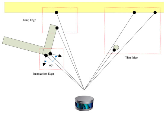 Edge Point Selection: A two-step edge feature detection procedure is presented, in which the coarse edge features are first selected based on the extracted planar features and then used to identify more reliable edge features. Let and be the position and normal vector of a point i in an image. As shown in Figure 3, a point is selected as a coarse edge feature if any of the following three scenarios are applicable: