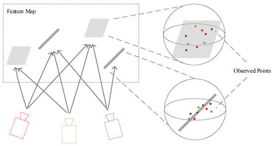 Each map feature that is neither planar nor angular corresponds to a residual in the final optimization formula. Suppose f is a map feature, and are the tracked local points of f in , where is the number of tracked points. can be zero if there are no associated features in . To construct the residual of f, we must first project its observation points into the global coordinate system using the transformation matrix obtained with Equation (2). The projection can be performed using the following equation: