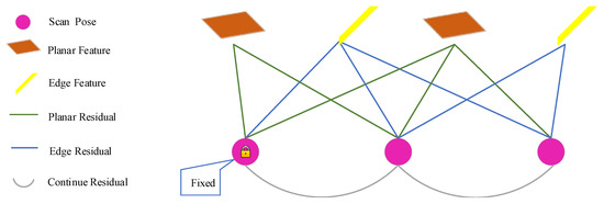 We use and to represent the planar and edge map features in the current map, respectively. The final optimization problem can be expressed as a combination of Equations (21) and (22):