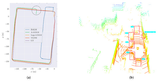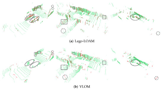 Velocity estimation: As described in Section 3.3.1, the velocity can be estimated either directly or based on the poses of two frames, followed by interpolation. Most open-source algorithms are based on the latter scheme. However, this can lead to closed loops between the pose and velocity estimates: the pose estimate requires that the velocity estimate produces an accurate and undistorted point cloud, while the velocity estimate, in turn, relies on the pose estimate. This type of iterative process cannot be repeated infinitely. In fact, most algorithms perform very few iterations; thus, it is difficult to achieve an accurate result in complex scenarios. This trend can be observed in Figure 10 and Figure 15. Since the HK-Data20190117 sequences were collected on a street surrounded by a complex environment, the velocity accuracies achieved by A-LOAM, BALM, and Lego-LOAM were lower than that achieved by VLOM; however, because the OS dataset was collected on a campus surrounded by several buildings and few people, A-LOAM and VLOM had similar velocity accuracies.