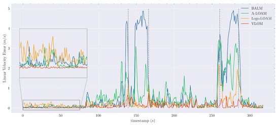 Since the UrbanLoco dataset does not include the angular velocity, we evaluated only the linear velocity. The results are shown in Figure 10. As seen from the magnified area in Figure 10, the car remained in the start position for an extended period of time. Lego-LOAM had a low stability and a large error at this stage. However, while driving, BALM and A-LOAM performed worse than Lego-LOAM. Although Lego-LOAM showed excellent accuracy, the region marked by the vertical dashed line in Figure 10 shows that Lego-LOAM had substantial errors. These regions correspond to the four corners of the overall sequence, indicating that the iterative velocity estimation algorithm cannot handle rotation distortions. In contrast, VLOM performed well on the entire sequence. Thus, the combination of bundle adjustment with direct velocity estimation allows for a tremendous improvement in terms of velocity accuracy.
