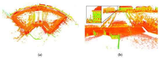 Livox Horizon is a solid-state LiDAR with a circular FoV of (horizontal) × (vertical) and a non-repeating scan pattern. Since solid-state LiDAR is a new technology, there are few publicly available datasets. We selected the KA-URBAN-Schloss-2 sequence (abbreviated as Schloss-2), which was provided in the work on LiLi-OM [34]. Schloss-2 was recorded at a typical sampling rate of while traveling with a sensor suite in Karlsruhe, Germany. The total length of this sequence is approximately . The walking speed is approximately . The author does not provide the ground-truth trajectory. Therefore, the RPE is not available. For quantitative comparison, because the sequence ends at its starting position, the end-to-end position error can be used as an evaluation metric.