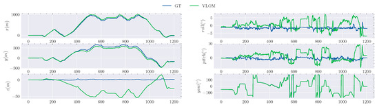 Since previous works have not included RS-LiDAR-M1, only VLOM was assessed on the RS dataset. The ground truth aligned to Google Earth is shown in Figure 13a, and the estimated trajectory of VLOM is shown in Figure 13b. Since there is no module that can close the loop, drift is inevitable, yet our results rarely overlap with the ground truth. Moreover, Figure 14 shows the deviations in the position and orientation. The error is mainly caused by , implying that the constraints in the vertical direction are insufficient. Since these constraints are mainly imposed by the ground features and the main direction of the LiDAR sensor is parallel to the ground, it is difficult to effectively extract features.