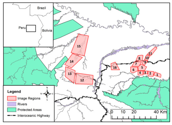 Our main study region is located within the Peruvian department of Madre de Dios (MDD), a globally significant hotspot of ASGM activity. We selected 16 distinct smaller region samples (~70 km2 each) of interest within MDD to highlight locations that had experienced mining pond surface-area increases as well as notable deforestation (Figure 2; Table A1 in Appendix A). These regions were selected for two main reasons: firstly, the regions spanned a gradient of significant mining intensity, techniques, and policy enforcement over the last 15 years. Secondly, the regions were shaped so as to maximize the number of pixels undergoing change between bi-temporal images, thereby providing a more thorough test of the models. A total selection of sixteen regions allowed for a fully representative sample of sites with these two considerations in mind.