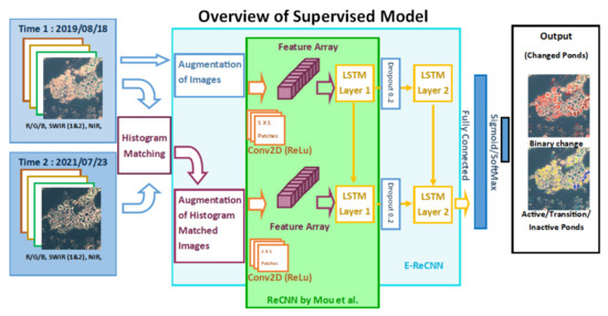 The E-ReCNN model uses two cloud-free Sentinel 2B images obtained from two different times (18 August 2019 and 23 July 2021) for the same region. Following histogram matching and augmentation, we used a convolutional kernel (Conv2d) on 5 × 5-pixel patches across each image to generate a feature array. These feature arrays then served as the input of the first LSTM layer, and the second LSTM layer was formed following a dropout of 0.2. The last two layers were fully connected, and an output layer was applied with sigmoid/softmax functions to recognize the change in the pond’s status.