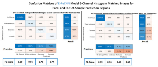 Overall, the E-ReCNN model performance using the 6-channel histogram-matched image sets from the 16 MDD regions resulted in outcomes with high levels of precision, recall, and F1-score (Figure 7, left). Model F1-scores for ‘no change’ and ‘water existence’ classes were 0.99 and 0.96, respectively. F1-scores for ‘increase’ and ‘decrease’ classes were slightly lower than ‘no change’ and ‘water existence’ classes, although the total quantity of labeled pixels for those two classes was notably lower. This pattern of F1-scores across classes was also seen in the out-of-sample regions (Figure 7, right). The total number of classified pixels in these regions was significantly lower, and F1 values for the ‘decrease’ and ‘increase’ classes were 0.56 and 0.57, respectively. The performance metrics not biased by smaller sample sizes, including Cohen’s Kappa and Jaccard coefficients, were higher than 0.9 for both the MDD regions as well as international out-of-sample regions. In contrast, the SVM-STV model results for ‘water existence’, ‘increase’, and ‘decrease’ classes were less accurate than the E-ReCNN model results, as shown in Figure 8 for the MDD regions (left) and out-of-sample regions (right). F1-scores for the MDD region ‘increase’ and ‘decrease’ classes were lower using this semi-supervised method than the out-of-sample regions, as modeled by E-ReCNN. Model results for the out-of-sample regions using SVM-STV were very low with respect to F1-scores, below 0.15 for the ‘increase’ and ‘decrease’ classes.