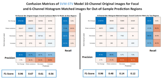 Future work may allow for an improvement of the SVM-STV model, particularly since the training size of labeled pixels used in this test was small and likely contained outliers and noisy pixels that could affect the quality of the model. Although histogram matching reduces radiometric differences in bitemporal images, the disparities among training regions can be significant and influential. Instead of randomly selecting training pixels for a generalized model, kernel density estimation may be used as an indicator that gives information about the “commonness” of each pixel [69,70]. This allows for the exclusion of outliers by only selecting pixels at high densities, generating more consistent test results. Furthermore, the SVM-STV model may be improved by including an active learning scheme, which takes into account the practical condition that there is a restricted budget for label collection. The diffusion geometry of the data can be used to push the approach even further by reducing the number of labels needed but producing greater performance [69,70,71].