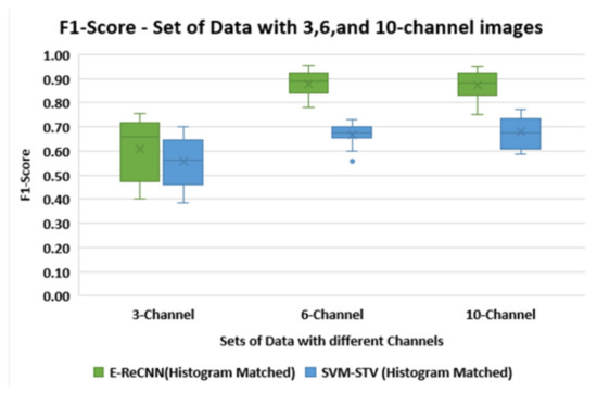Analysis of multi-class results according to different numbers of channels by F1-score. Results of histogram-matched images according to 3-, 6-, and 10-Channel sets are shown based on F1-score. The E-ReCNN model results had higher accuracy than the SVM-STV model. The 6-Channel results average was more accurate and had less standard deviation than the 3- and 10-Channel results.