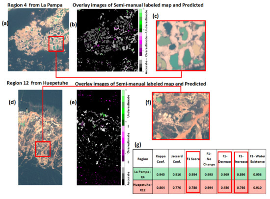 (a) True-color image composites of Region 4 in La Pampa (b) the overlay images of semi-manual label maps and model-predicted results of Region 4, (c) zoom in the ponds of Region 4, (d) True-color image composites of Region 12 in Huepetuhe (e) the overlay images of semi-manual label maps and model-predicted results of Region 12, (f) zoom in the ponds of Region 12, and (g) results table for two regions 4 and 12. These two different regions show how signatures of mining using different practices may generate more or less uniform surface water bodies. In (b) and (e), white and shades of gray represent accurate classification, shades of magenta represent overestimated sediment, shades of green represent underestimated sediment, and black represents no detected change. While Region 4 from La Pampa has deeper and more circular ponds that are separated by sand, Region 12 from Huepetuhe has more shallow, small and intricate ponds mixed with sand and bare ground, which appears to impact accuracy metrics.