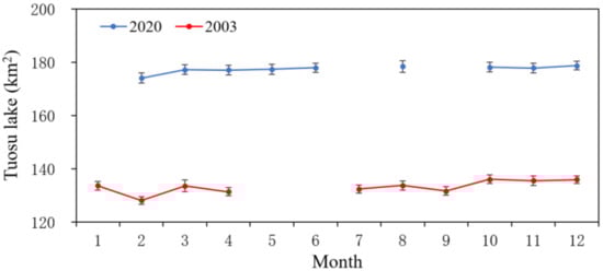 Lakes generally have seasonal variations, which possibly affect the interannual trend analysis of change in the lake surface area. Considering this effect of seasonal variations, the monthly variations of the Tuosu Lake surface area in 2003 and 2020 were extracted (Figure 2). The results show that the lake surface areas of Tuosu Lake in 2003 and 2020 were 128.2–136.1 km2 and 174.0–178.7 km2 with uncertainties within 1.6% and 1.2%, respectively. This indicates that the extracted lake surface areas are reliable. The maximum differences of lake surface area caused by seasonal variation are 7.9 km2 and 4.7 km2 in 2003 and 2020, respectively, and the relative deviation is within 4% and 2%, respectively. Therefore, the seasonal variation has only a slight effect on the interannual trend of the lake surface area.