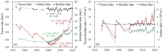 (a) Plot depicting the change of lake surface area in the study region extracted from Landsat satellite images. Triangles (before 2000) represent data in the literature [31,32]. y, y1, and y2 represent the least square fitting line of the surface area in Gahai Lake after 2000, Tuosu Lake from 2003 to 2011, and after 2011, respectively. Black error bar represents the uncertainty of the extracted lake surface area. (b) Calculated change in lake storage (ΔV). The solid line, dashed lines in dark gray and light gray are the calculation results when the slope (I) is 3, 2, and 4, respectively.