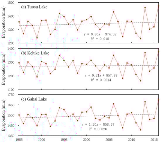 Plots exhibiting the evaporation of Tuosu (a), Keluke (b), and Gahai Lakes (c) calculated by the improved Penman–Monteith model.