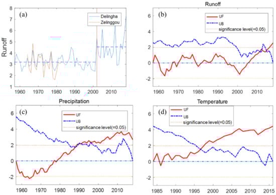 Plots depicting the change of runoff at Delingha and Zelinggou stations (a), results of MK test for runoff (b), precipitation (c), and temperature (d) at Delingha station.
