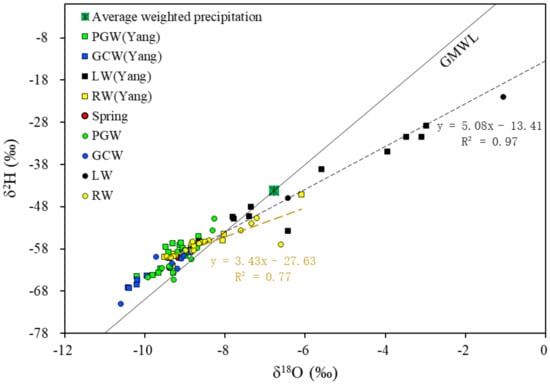 Plot illustrating δ18O vs. δ2H diagram of groundwater, lake water, river water, and spring water in the study area of the Qaidam Basin, China. Squares represent samples from the literature [11].