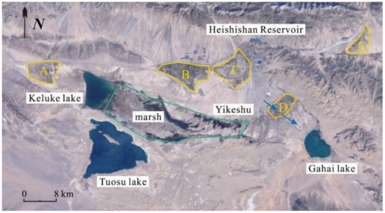 Furthermore, when the water level of Keluke Lake rises, the water can be discharged to Tuosu Lake through the Lianshui River. The Huaitoutala irrigation area (A) and nearby villages are located northwest of Keluke Lake (Figure 8), at higher elevation than both Keluke Lake (by 36 m) and Tuosu Lake (by 48 m). Therefore, the future expansion of Tuosu Lake will have little impact on the nearby irrigation areas and villages but is likely to promote expansion of the marsh in the northeast of Tuosu Lake. Considering the long-term trend of climate warming, a rise in groundwater levels in the vicinity of Gahai Lake is inevitable. Therefore, to ensure the safety of residents and continued operation of the irrigation area, drainage channels can be excavated at the end of the alluvial fan to divert groundwater to the Bayin River. Despite the potential for further increases in the water level of Tuosu Lake after channel excavation, the lack of villages and farmland around the lake makes this an appropriate management solution.