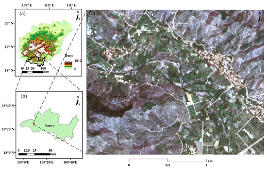 The study area location. (a) The DEM of Hainan. (b) The study region, located in the southwestern Sanya city, China. (c) Gaofen-2 imagery composed of band 3, 2, and 1 (red, green, and blue bands, respectively).