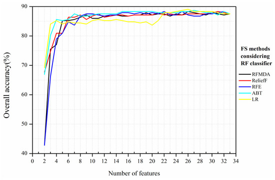 Relationships among overall accuracy and the number of features based on random forest (RF) classifier. RFMDA, RFE, ABT, and LR are the abbreviations of random forest mean decrease in accuracy, recursive feature elimination, aggregated boosted tree, and logistic regression, respectively.
