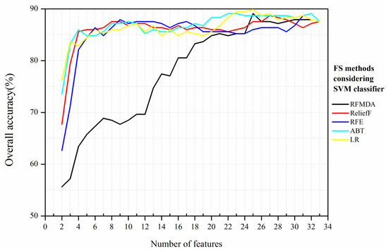 Relationships among overall accuracy and the number of features based on support vector machine (SVM) classifier. RFMDA, RFE, ABT, and LR are the abbreviations of random forest mean decrease in accuracy, recursive feature elimination, aggregated boosted tree, and logistic regression, respectively.