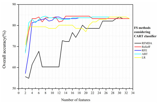 For the CART classifier, the highest OA (84.43%) was achieved with ABT and eight features, forming a parsimonious classification model because it needed the minimum number of features. Figure 7 shows that ABT, ReliefF, and RFE had almost the same curve between 14 and 22 features. For LR, the OA showed no obvious variations between 3 and 19 features. Apart from RFMDA, the remaining four FS methods presented relatively high OA accuracy (>80%) when there were more than three input features. The curve of RFMDA fluctuated greatly, indicating that dimensionality reduction did not cause the OA to increase. This may be because the important features that suit the CART classifier were eliminated.