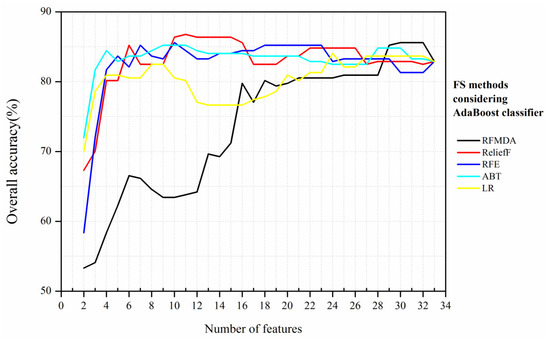 Relationships among overall accuracy and the number of features based on AdaBoost classifier. RFMDA, RFE, ABT, and LR are the abbreviations of random forest mean decrease in accuracy, recursive feature elimination, aggregated boosted tree, and logistic regression, respectively.