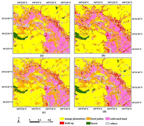 Based on the visual interpretation from the classification maps, the mango plantations and betel palms were the principal tropical crops in the study region, and mango plantations were located throughout the surrounding betel palms and cultivated land (Figure 9). The classification results were close to our previous field survey data. There were slight differences in the specific depictions under different classification schemes when the same tropical crops were compared. For example, the confusion of mango plantations and forest in the northeastern corner of the study region was more apparent in machine learning classifications that utilized the RF-LR and AdaBoost-ReliefF methods when compared with classifications using other approaches. However, the maps based on the two aforementioned approaches produced fewer jagged edges along narrow forest areas in the southeastern corner of the study region. The RF-LR method produced a more accurate visual depiction of betel palms than any classification approaches, although there remained some misclassification among forest and cultivated land and betel palm regions because of the similar spectral characteristics [30]. Moreover, the boundary between betel palms and built-up land was not well distinguished for all classification schemes.