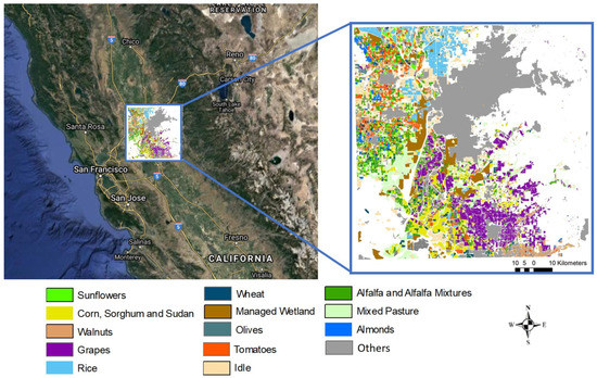Study area in the Central Valley of California, USA (left) and land-use classes from the CROP2014 dataset (right).