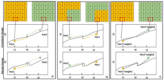 Schematic diagram of different STARFM modes operating under consistent change and abrupt change conditions. On the top of each panel is an example of pair information at the pixel level. (a) One-pair STARFM; (b) two-pair STARFM; (c) proposed dual-pair STARFM.
