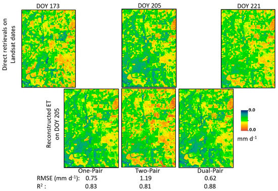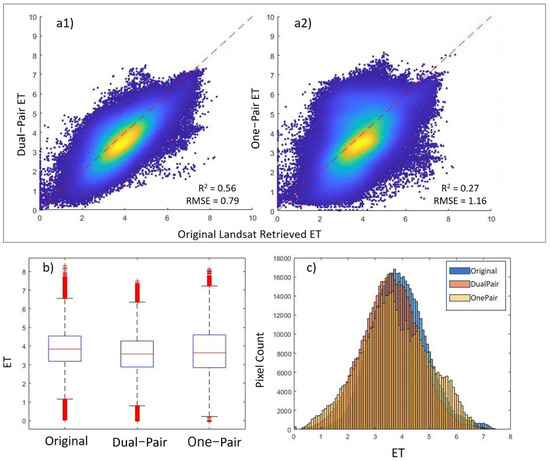 Figure 8a shows a scatter plot comparison of ET for grape pixels on DOY 173 reconstructed using both fusion methods with directly retrieved ET. The one-pair method has a much broader scatter in comparison with the dual-pair method. From the box plots in Figure 8b, the interquartile range and 1.5 interquartile range of the dual-pair results is similar to that of the direct Landsat ET retrieval, but slightly lower. The one-pair results have a broader interquartile range than that of the original Landsat ET, as well as higher maximum and lower minimum values. The histogram comparison in Figure 8c shows that the one-pair method overestimates ET in the range between 5.5 to 6.8 mm/day, while underestimating ET in the highest ET range. The dual-pair histogram better matches the original distribution, underestimating when ET is higher than ~4 mm/day and overestimating rates lower than 4 mm/day.