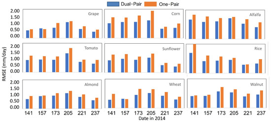 Comparison of RMSE between dual-pair and one-pair for the tested Landsat overpass days in 2014 for major crop types.