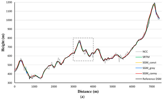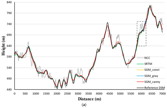 As seen in Figure 6a, the range of the height profile along is 440–840 m. The height curves of SGM DSMs and SRTM DEM are close to each other. To examine the difference between the height curves more closely, we zoomed in on a portion marked by a dotted box in Figure 6b. The zoomed view shows the height profile from SGM_canny algorithm was closest to the reference DSM. The SRTM DEM profile generally deviates more from the reference DSM than the SGM profiles. NCC curve contains the biggest deviations in height. Profiles along show a similar trend in Figure 7.