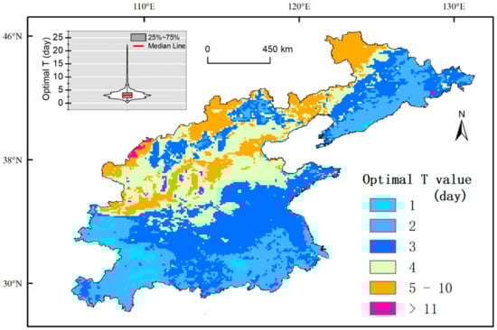 The EF model was calibrated and validated using ERA5 SSM and RZSM datasets for each 10 km grid, obtaining the distribution map of the optimum T parameter (Topt) (Figure 3). In the upper left box diagram, Topt for all grids were in the range of [2, 4], with an average of ~3 days. In terms of spatial Topt distribution, the optimum T parameter showed an increasing trend from the eastern humid areas to the western semi-humid areas: the minimum Topt occurred in the southern Middle-lower Yangtze Plain and northeastern Northeast China Plain areas (humid areas with annual rainfall >800 mm), with a value of 1–3 days; while larger Topt was found in those semi-humid (Huang-Huai-Hai Plain) and semi-arid (Loess Plateau) areas, with most values in 4–10 days. As mentioned above, Topt is a comprehensive parameter affected by multiple factors, which is not only related to the climatic conditions and vegetation in the region, but also affected by the soil properties. For instance, the fine texture with low sand content and high clay content, will affect the movement and stagnation of soil water, which can be reflected in the parameter Topt.