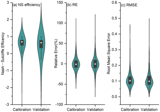 For all 10 km grids, the performance of EF model was evaluated using the three statistical metrics, i.e., NSE, RE, and RMSE. Overall, EF model showed good performances both in the calibration and validation period, as presented by the violin diagrams (Figure 4). The average NSE () of all grids reached 0.82 and 0.78 in calibration (2006–2013) and validation (2014–2017) period, respectively, indicating a good reliability of EF model calibrated using ERA5 datasets in those study areas. The EF model also had low RE and RMSE both in the calibration and validation period (: ~10%; : ~0.08 m3/m3), indicating low bias between the simulated RZSM and the ERA5-provided RZSM at ~10–30 cm depth.