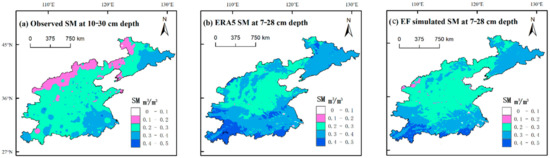 By contrast with the in situ observed RZSM, both ERA5-provided RZSM and ERA5-derived RZSM by the EF model can capture the spatial variations of RZSM in a large part (Figure 5): spatial distributions of RZSM were effectively estimated in the study area, despite the overestimation in some marginal areas, e.g., the southern Middle-lower Yangtze Plain. Meanwhile, ERA5-derived RZSM by the EF model showed similar spatial performance as the ERA5-provided RZSM itself in estimating RZSM, which even presented higher estimation accuracy for some semi-humid and -arid areas against the in situ observed RZSM. Despite the slight difference between the depth of 7–28 cm and 10–30 cm, soil moisture will not show much variations between the two depths; thus, the in situ ground RZSM observations at 10–30 cm could act as the approximate “ground reference” to evaluate the ERA5-provided and -derived RZSMs at 7–28 cm.