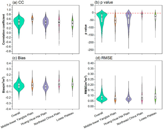 Distribution violin diagrams of CC (a), p value (b), bias (c), and RMSE (d) between ERA5-derived RZSM and in situ ground observations. Presented are the median, the 1st quantile Q1 and 3rd quantile Q3 (as indicated by the box), and the Q1 − 1.5(Q3 − Q1) and Q3 + 1.5(Q3 − Q1) values (whiskers). (The red dash line in (b) indicates p = 0.05).