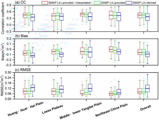 Distribution box diagrams of CC (a), bias (b), and RMSE (c) between SMAP L3-derived and SMAP L4-provided RZSMs and in situ ground observations among different agricultural zonings. Presented are the median, the 1st quantile Q1 and 3rd quantile Q3 (as indicated by the box), and the Q1 − 1.5(Q3 − Q1) and Q3 + 1.5(Q3 − Q1) values (whiskers).