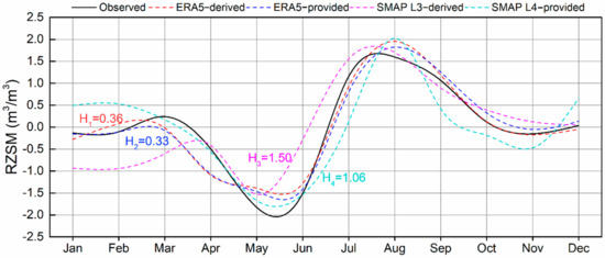 The seasonality of all estimated RZSMs were further compared with the in situ observations in Huang-Huai-Hai Plain areas (Figure 11). Herein, Huang-Huai-Hai Plain was chosen as the typical case mainly considered the most densely distributed SM observation stations in those areas that can best represent the ground reference of SM dynamics [43]. The Hausdorff distances and Person CC were computed as performance metrics of reflecting the seasonality by different RZSM versions. Of these RZSM trajectories, the ERA5-derived and -provided RZSMs showed similar performance in reflecting seasonal changes of RZSM, as presented by similar CC of 0.96 and 0.95 (p < 0.001) with the observed RZSM series. The Hausdorff distances between ERA5-derived and -provided RZSMs away from the observed RZSM trajectory also proved their similar seasonality reflection performance, reaching 0.36 (H1) and 0.33(H2), respectively. Furthermore, the SMAP L3-derived RZSM showed similar performance with the SMAP L4-provided RZSM in reflecting seasonal RZSM distribution: the CC of SMAP L3-derived and SMAP L4-provided RZSM with the observed trajectory reached 0.74 and 0.77 (p < 0.001); and the corresponding Hausdorff distances were 1.5 (H3) and 1.06 (H4), respectively.