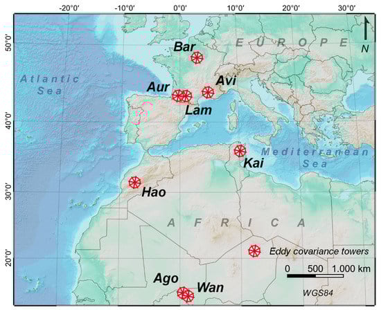 Furthermore, three EC towers were installed near Niamey (Niger) in a desert area under a BWh climate influence, with a MAAT of ca. 30 °C and a MAP of ca. 300 mm. Agofou (Ago) site is located in a millet zone, whereas in Wankama (Wan) one EC is located on the savannah, and another one is placed in a zone of wheat crops. Ts was recorded with an incidence thermal infrared thermometer (KT15; 8 to 14 m wavelength domain, manufactured by Heitronics) at 2.9 m height. Further details of the Niger EC sites can be found at [40,41].