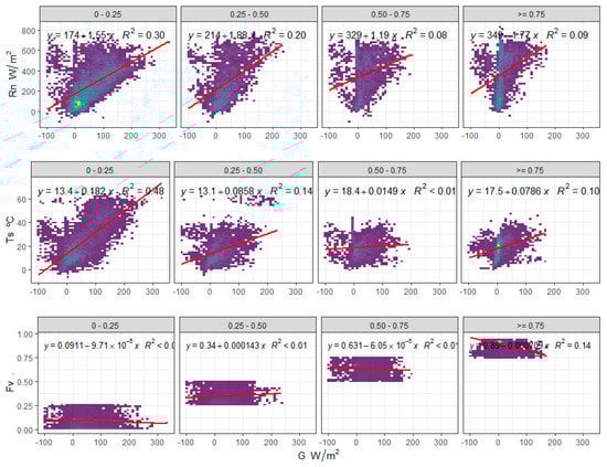 Regression analysis of the observed G (W/m2; x-axis) and the main drivers of G (W/m2; y-axis) grouped by Fv ranges. The first row corresponds to Rn (W/m2), the second to Ts (°C) and the last one to Fv.
