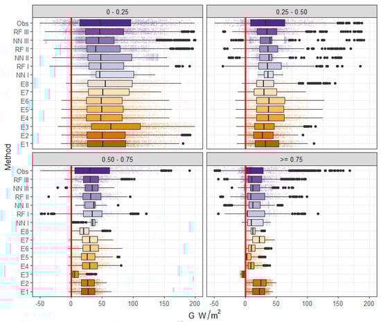 Box plot of the estimated G values (W/m2), grouped by the method (y-axis), and Fv ranges.