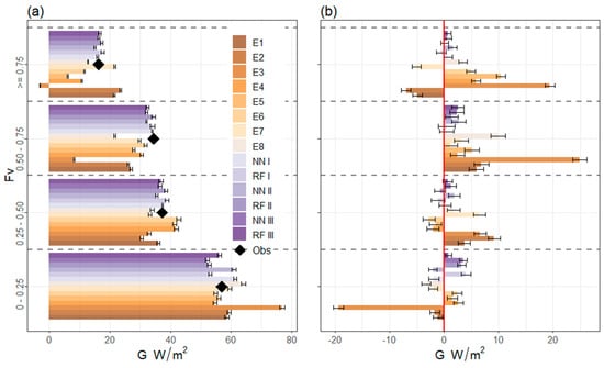 The estimation of G with ML has shown lower residual differences than those obtained with the empirical equations (Figure 6). In fact, the residual term with ML is practically the same (avg. ca. 5 W/m2) for the majority of Fv ranges. In addition, no systematic biases are estimated with ML II and ML III. Furthermore, ML II and III are able to reproduce the highest (percentile 90th) G values (Figure 3). The validation metrics by Fv ranges are shown in Table 3 and Figure 7 and Figure 8. The results provide evidence that the estimation of G based on Type I empirical equations leads to high uncertainties in comparison with the ML methods. The error metrics for the majority of the Type I empirical equations are practically the same under bare soils and scarce vegetated areas (MAE = 36 and RMSE = 51 W/m2). Nevertheless, the highest differences between Type I equations are observed in densely vegetated areas. The accuracies of E1, E2 and E3 are worse than the group constituted by E4, E5 and E6 (avg. MAE 24 vs. 18 W/m2), confirming the E1, E2 and E3 systematic underestimation of the G. Type II improve the estimation of G to some degree. The accuracy of E8 (MAE = 28, RMSE = 39 W/m2) is slightly better than the E7 (MAE = 28, RMSE = 37 W/m2), but two Type I equations (E4 and E6) outperformed all the empirical equations for the estimation of G at dense and high canopies covers. Therefore, these results suggest that the estimation of G is more accurate with Fv data (E4 and E5) and LAI (E6) than with NDVI (E1, E2 and E3). The results presented in this article are in accordance with previous studies that estimated the G based on vegetation indexes [10,19,31]. The lack of difference between E7 and E8 suggests that the inclusion of α in the empirical formulations that already include Ts does not substantially improve the estimation of G. This is probably explained because of the collinearity existent between Ts and α.