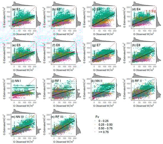 The observed and estimated G values by the different empirical equations and ML algorithms are shown in Figure 3 and Figure 4. The observed mean value of G ranged from 59 to 18 W/m2. In bare soils and sparse vegetation areas, where the majority of the data is found (Figure 2a), the highest G values are measured in accordance with previous works [21]. In these land types, characteristics of arid and semiarid climates zones, the highest values of G are generally observed during the warmest months of the year [31]. The G rules a significant part of the SEB hourly variability, with instantaneous G values ranging from 5–10% up to 50% of the Rn [30,55,56].