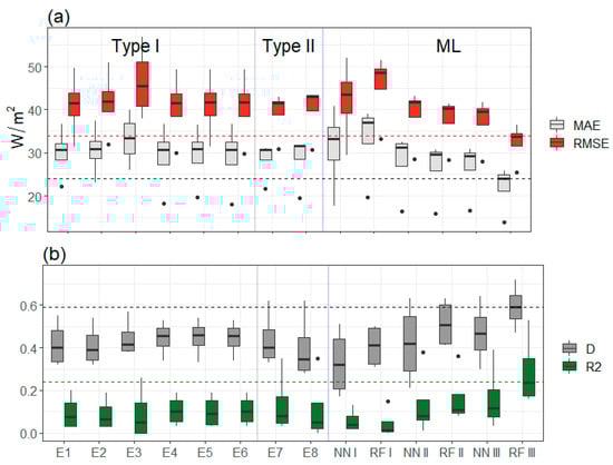 (a) Box plot of the MAE and RMSE values and (b) D and R2 boxplot grouped by method.