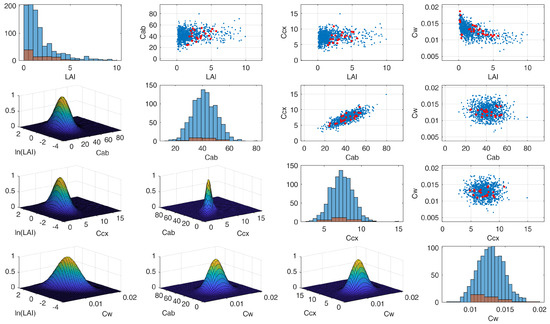 Example of PROSAIL-PRO random inputs generated from a multivariate normal PDF, considering covariance values among plant traits. Red dots in the scatter plots represent values measured during the Grosseto 2018 campaign; the blue dots are randomly sampled values used as input for the PROSAIL-PRO simulations.