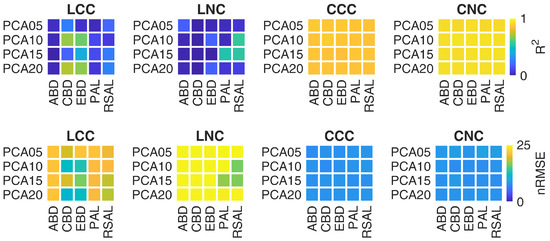 Regarding the dimensionality reduction, the results reported in Table 4 and Figure 3 show different trends at leaf and canopy level. In particular, HYB approach provided accurate CCC estimations for all tested DR configurations (R = 0.79–0.81, RMSE = 0.38–0.54 g m). CNC showed a similar trend, achieving good results for all PCA components (R = 0.83–0.84, RMSE = 1.10–1.31 g m). Regarding HAL approach, very good results were achieved at canopy level, for both CCC and CNC, considering all the tested combinations of spectral (PCA components) and sample (AL algorithms) reductions (R = 0.86–0.87, RMSE = 0.21–0.22 g m and R = 0.92–0.93, RMSE = 0.72–0.76 g m for CCC and CNC, respectively). Conversely, only some DR configurations provided good results at leaf level, as shown in Figure 3: CBD and EBD with PCA10, PCA20 and noPCA for LCC; PAL with PCA15 and RSAL with both PCA10 and PCA15 for LNC.